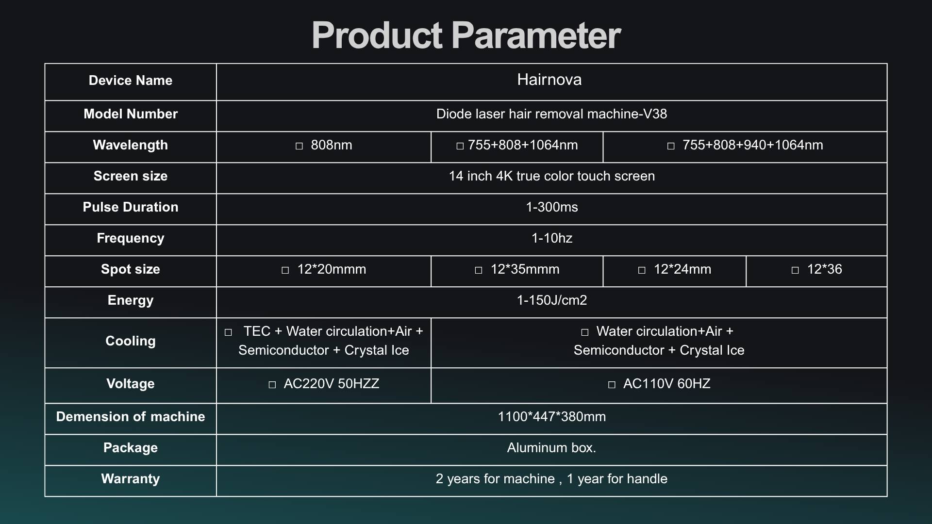 2) 1-10Hz swift frequency combined with a 12x20mm spot size for faster, seamless and effective results, fast hair removal for big area treatment.
