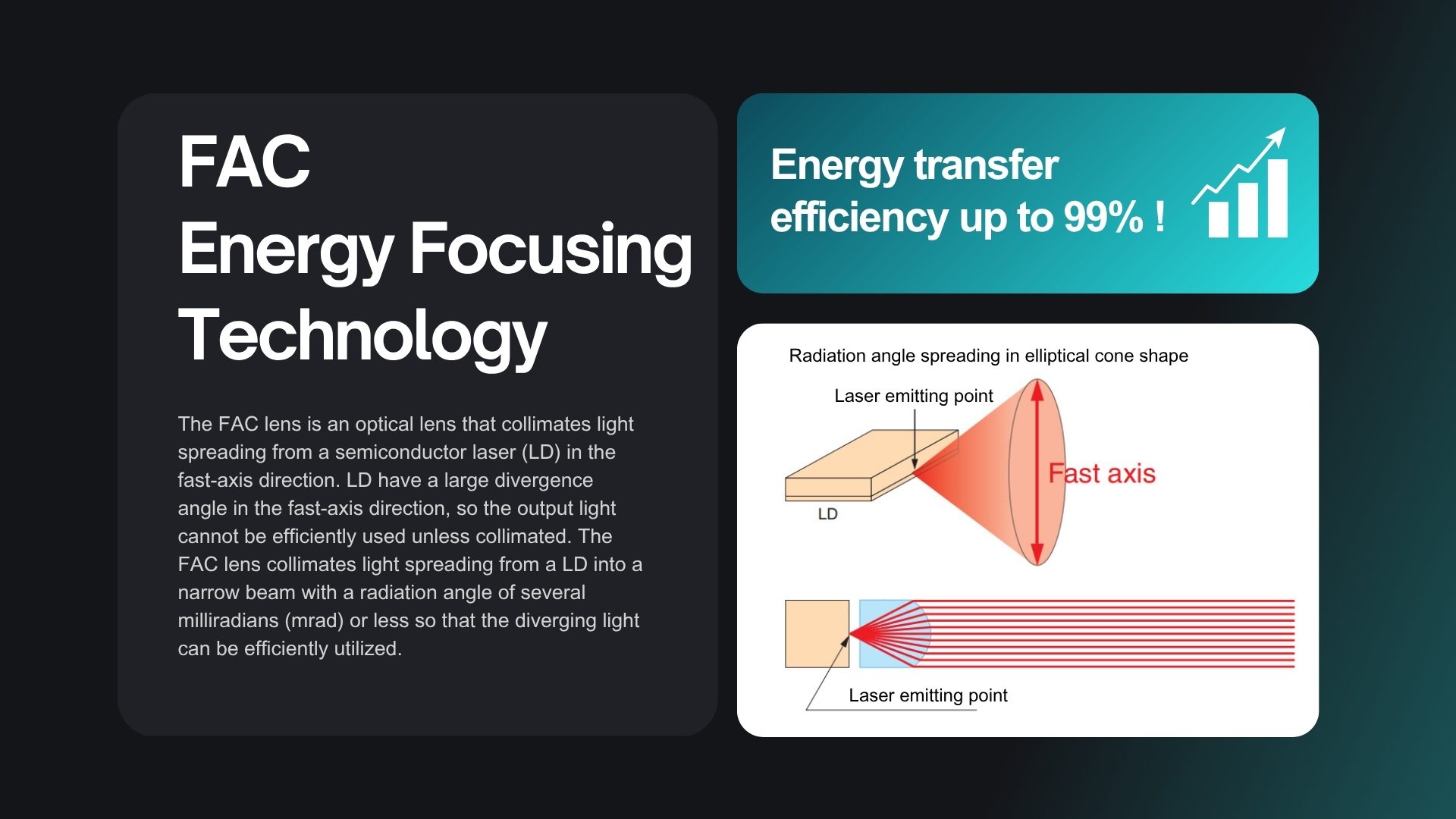 The FAC lens is an optical lens that collimates light spreading from a semiconductor laser (LD) in the fast-axis direction. LD have a large divergence angle in the fast-axis direction, so the output light cannot be efficiently used unless collimated. The FAC lens collimates light spreading from a LD into a narrow beam with a radiation angle of several milliradians (mrad) or less so that the diverging light can be efficiently utilized.