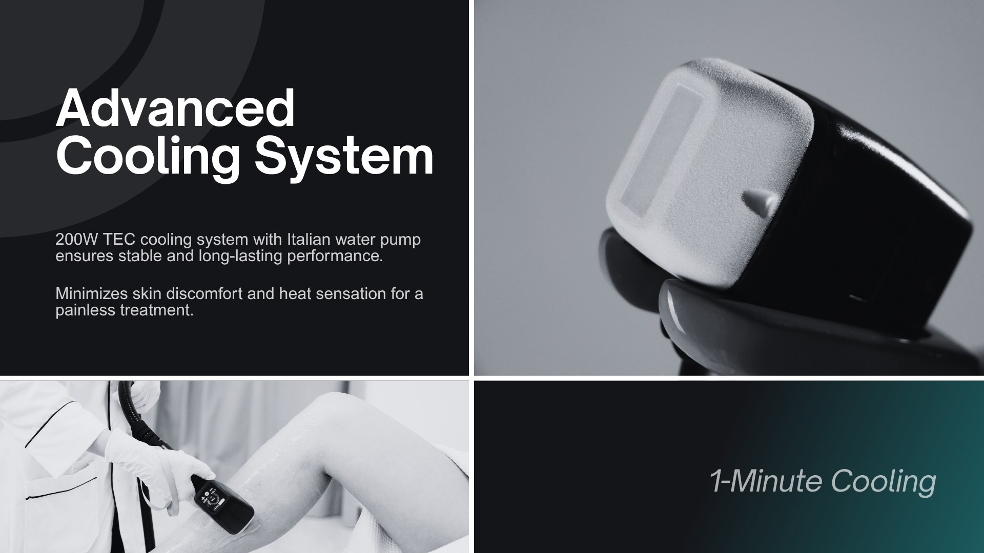 2000W TEC cooling system with Italian water pump ensures stable and long-lasting performance.Minimizes skin discomfort and heat sensation for a painless treatment.